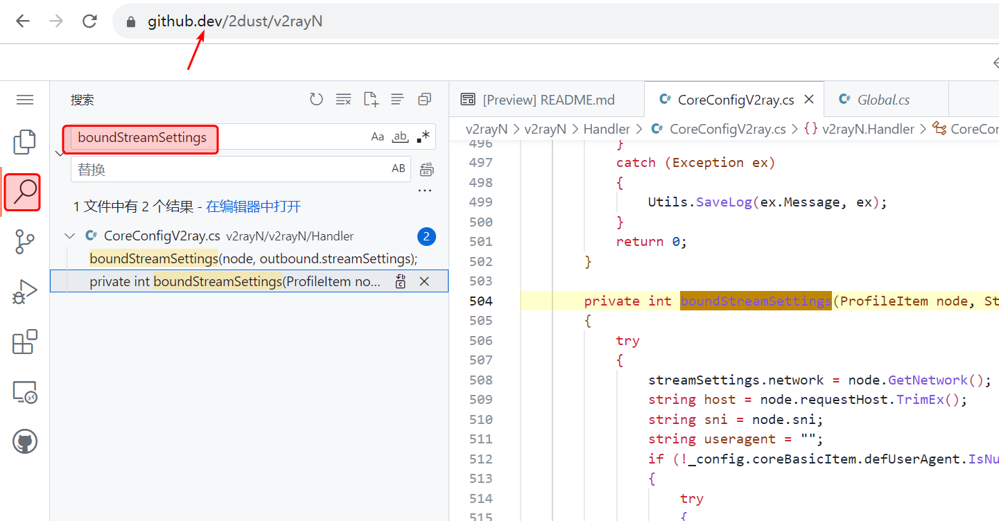 我们访问 https://github.dev/2dust/v2rayN, 然后在整个项目里面搜索 boundStreamSettings