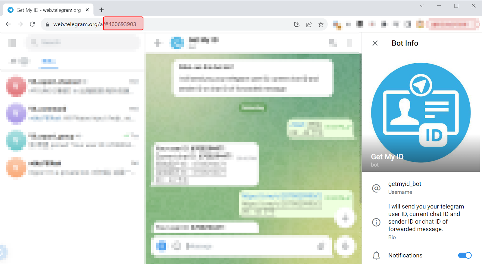 在你使用网页web版的telegram时, 你可以在浏览器的地址栏发现这样的ID