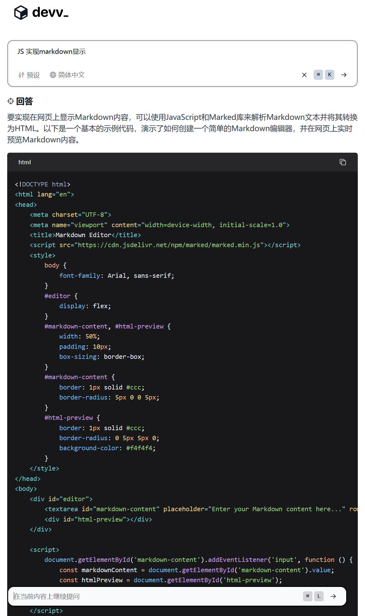 核心代码就是这一小段document.getElementById('markdown-content').addEventListener('input', function () {const markdownContent = document.getElementById('markdown-content').value;const htmlPreview = document.getElementById('html-preview');htmlPreview.innerHTML = marked.parse(markdownContent);});