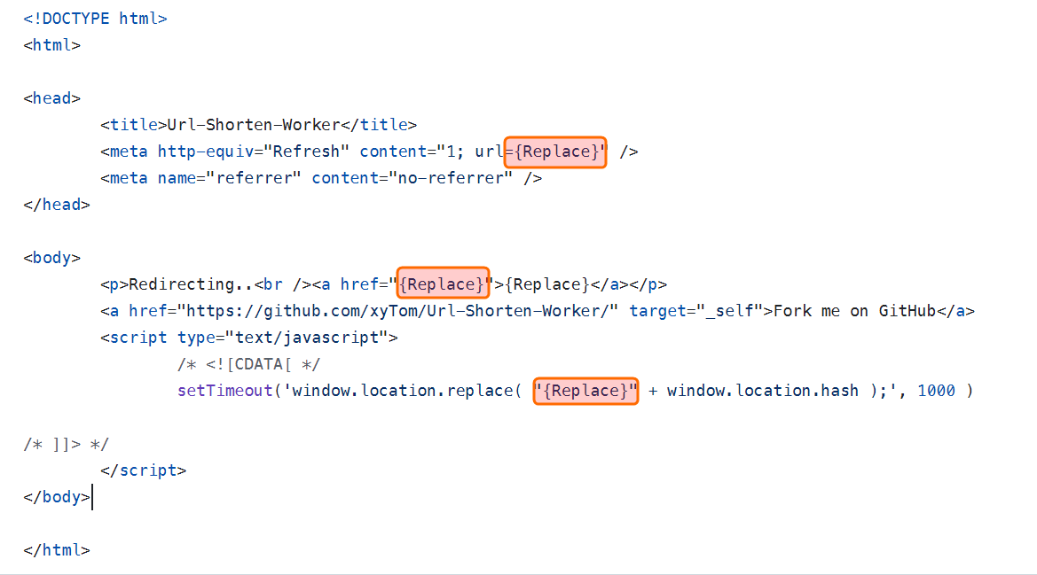 在 worker.js 里面, 加载了这个 no_ref.html 之后, 对奇异字符串 {Replace} 进行替换为目标长链接. 你可以理解为这个html文件被修改了. 然后再返回给浏览器显示(执行).