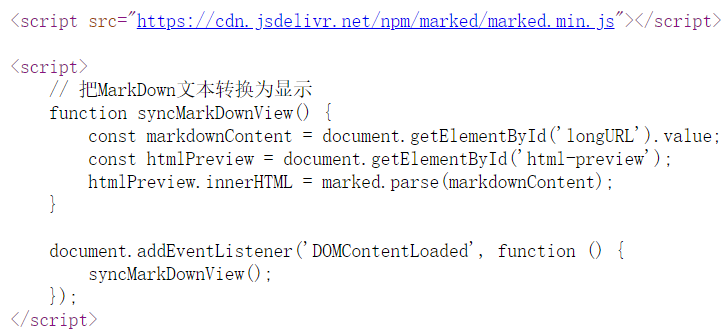 以前在 短链转markdown日记本 的方案中, 页面内容<textarea>中是markdown格式文本, 外面再挂一段简单的JS转换markdown到HTML.