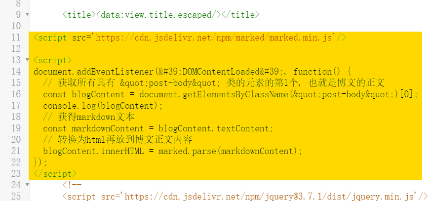 <script src="https://cdn.jsdelivr.net/npm/marked/marked.min.js"></script><script>document.addEventListener('DOMContentLoaded', function() {// 获取所有具有 "post-body" 类的元素的第1个, 也就是博文的正文const blogContent = document.getElementsByClassName("post-body")[0];// 获得markdown文本const markdownContent = blogContent.textContent;// 转换为html再放到博文正文内容blogContent.innerHTML = marked.parse(markdownContent);});</script>