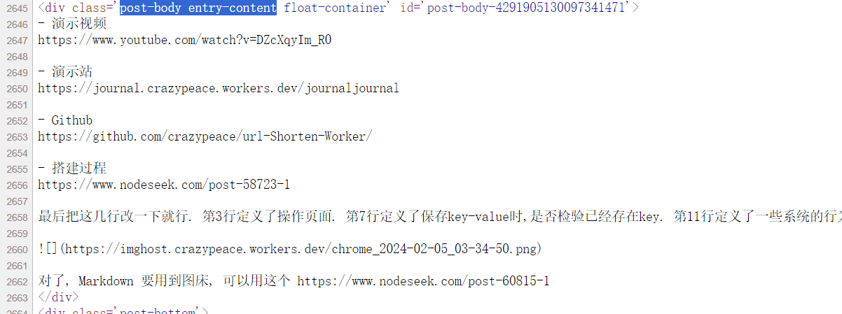 然后查看此页面的源码, 发现正文的html部分有class为 post-body entry-content