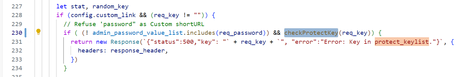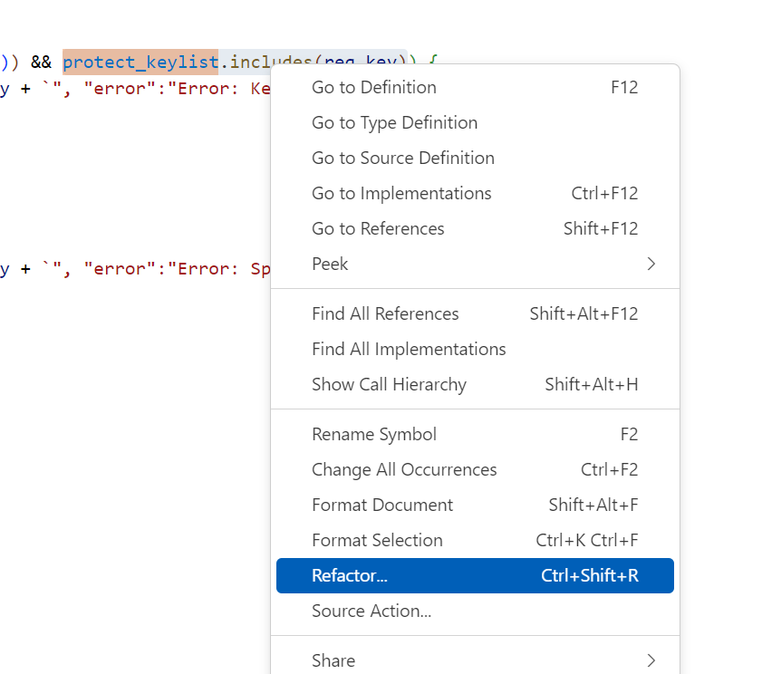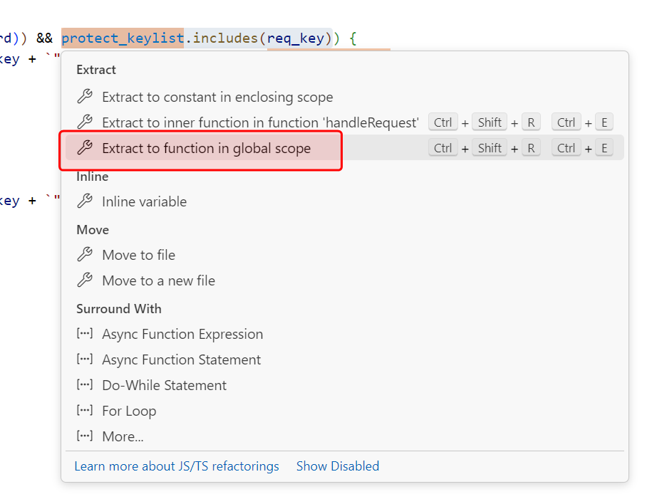 鼠标拖选 "protect_keylist.includes(req_key)" , 右键, "Refactor...", "Extract to function in global scope",