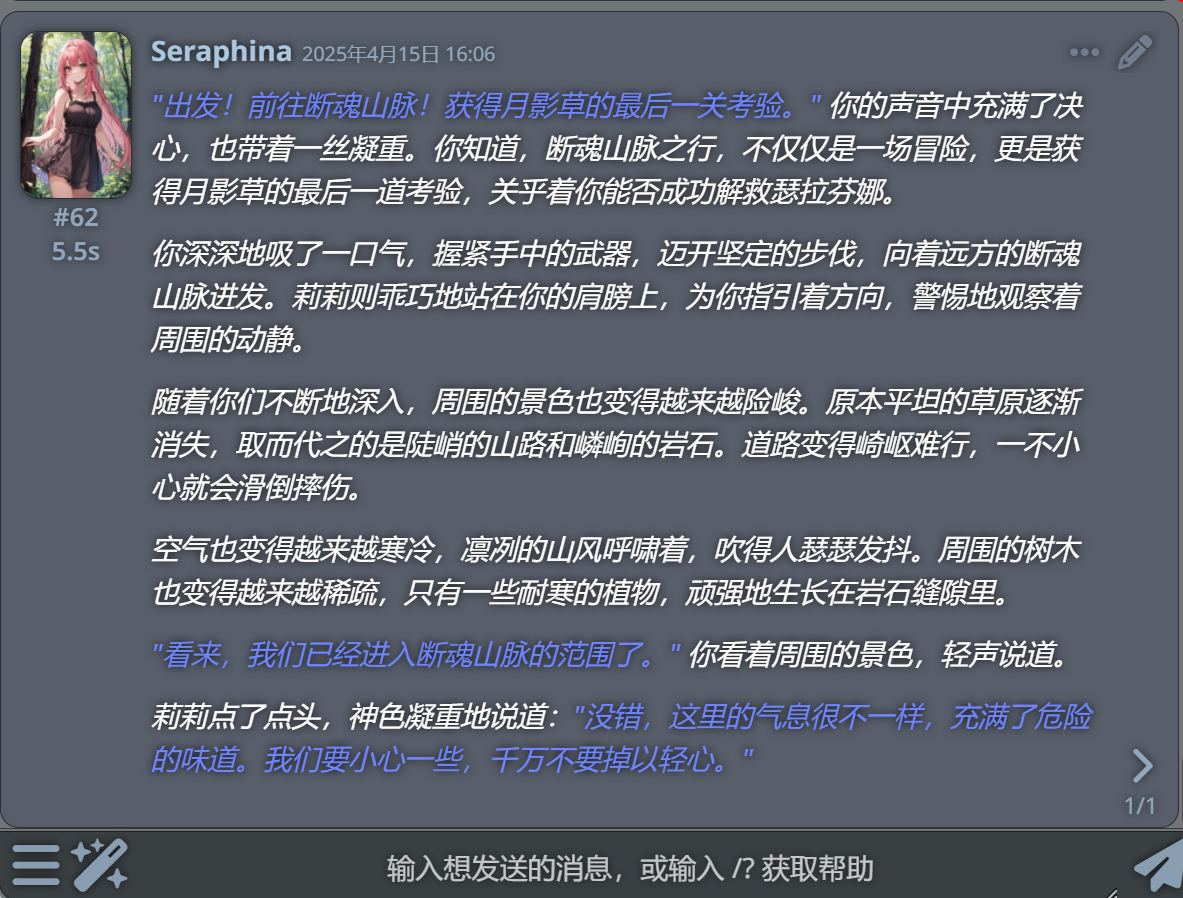 但是, 这些分析足够我们知道, 酒馆的本质就是如此. AI侧不会保存针对每个使用者的记忆, 使用者每次都需要带上足够的信息作为 prompt 才能让AI生成看上去符合"记忆"的新的一段话.