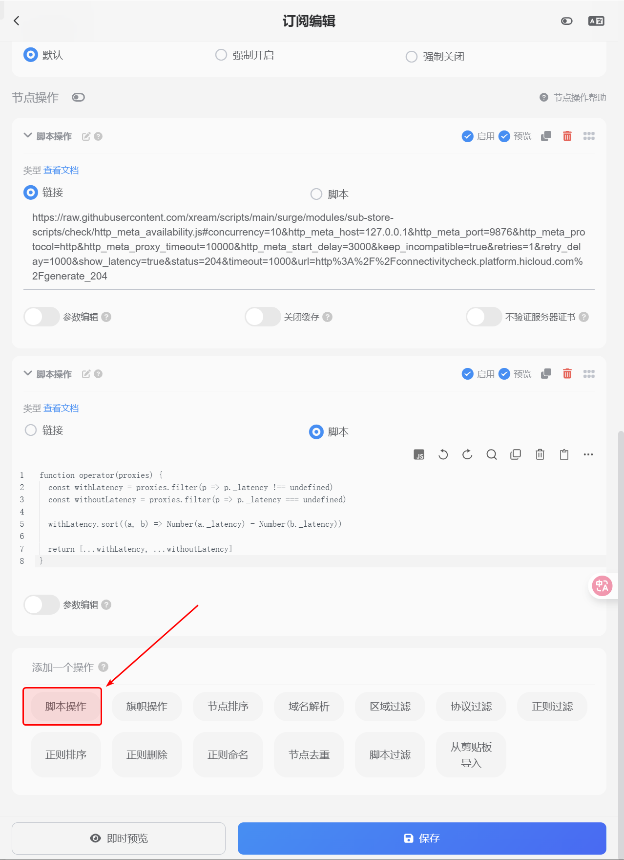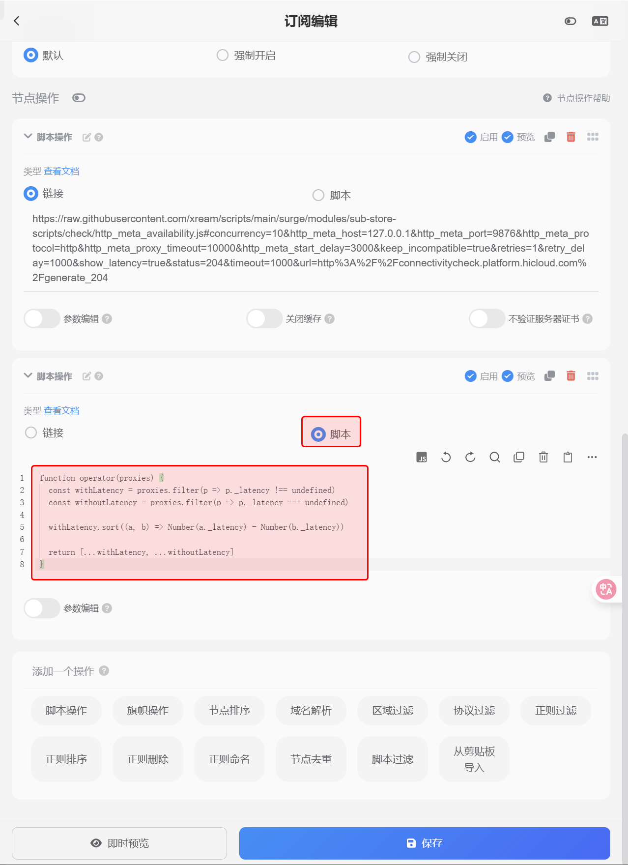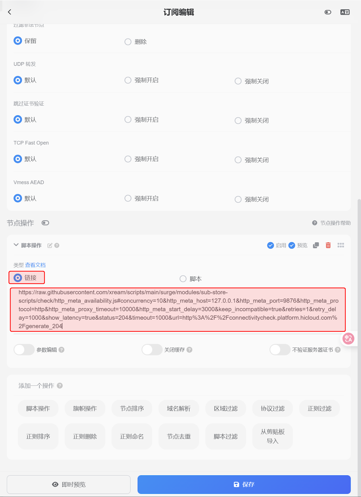 https://raw.githubusercontent.com/xream/scripts/main/surge/modules/sub-store-scripts/check/http_meta_availability.js#concurrency=10&http_meta_host=127.0.0.1&http_meta_port=9876&http_meta_protocol=http&http_meta_proxy_timeout=10000&http_meta_start_delay=3000&keep_incompatible=true&retries=1&retry_delay=1000&show_latency=true&status=204&timeout=1000&url=http%3A%2F%2Fconnectivitycheck.platform.hicloud.com%2Fgenerate_204