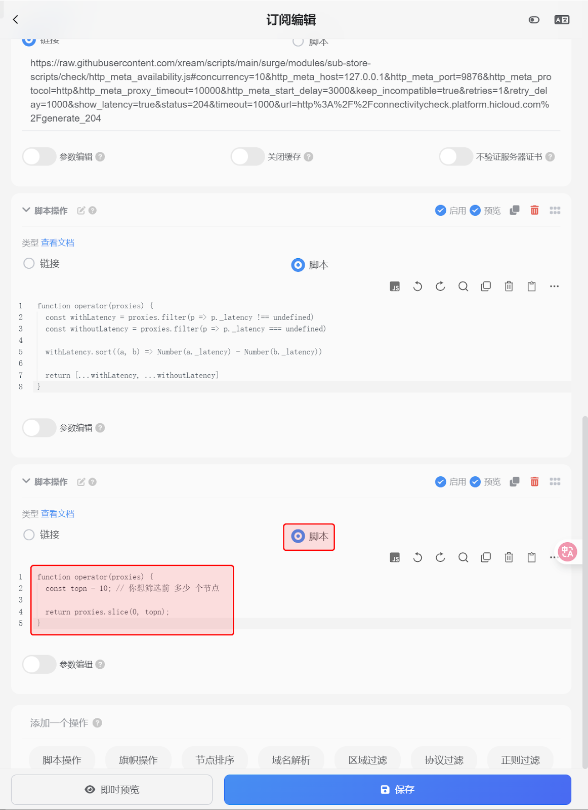 function operator(proxies) {const topn = 10; // 你想筛选前 多少 个节点return proxies.slice(0, topn);}