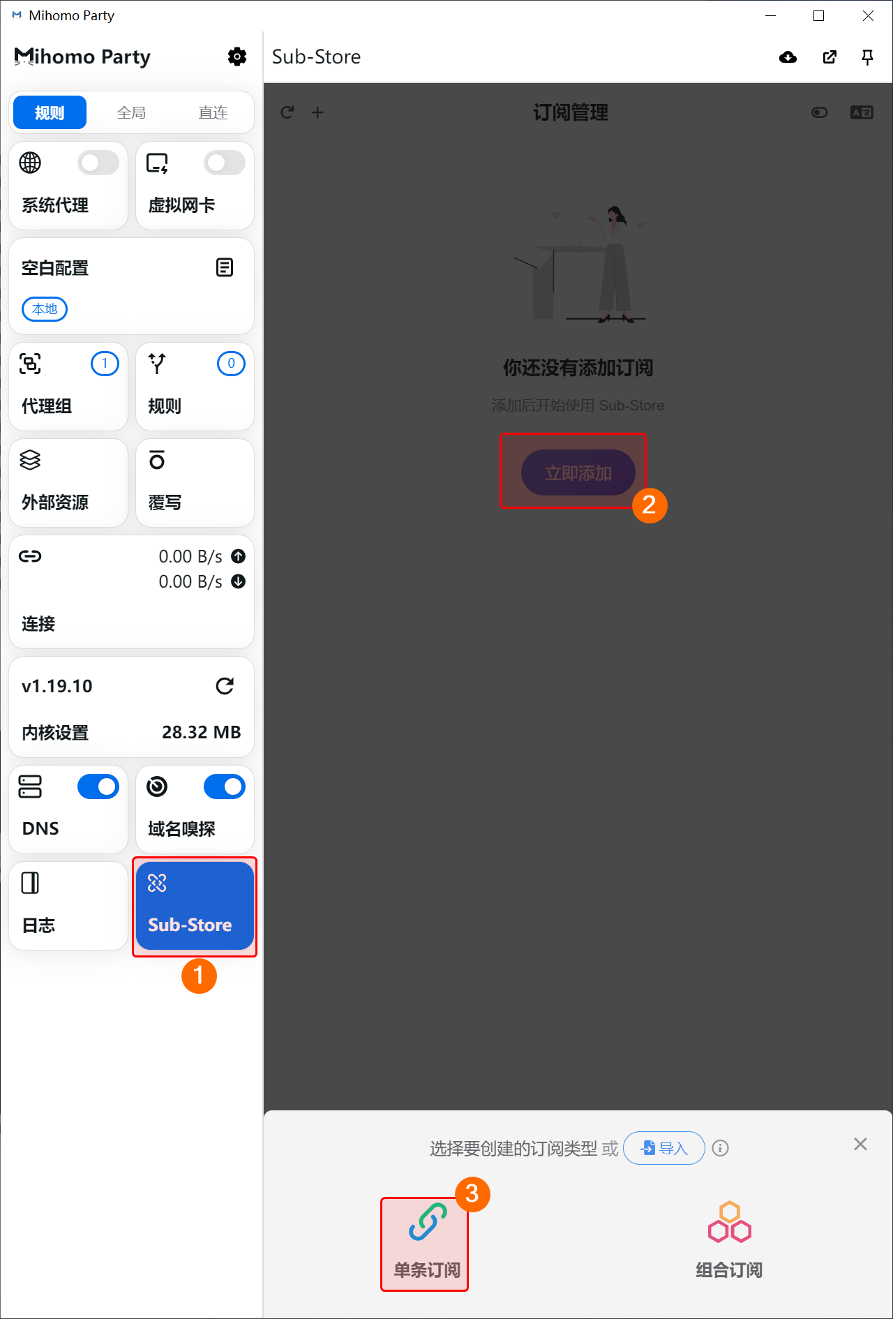 打开 Mihomo 自带的 Sub-store, 添加单条订阅