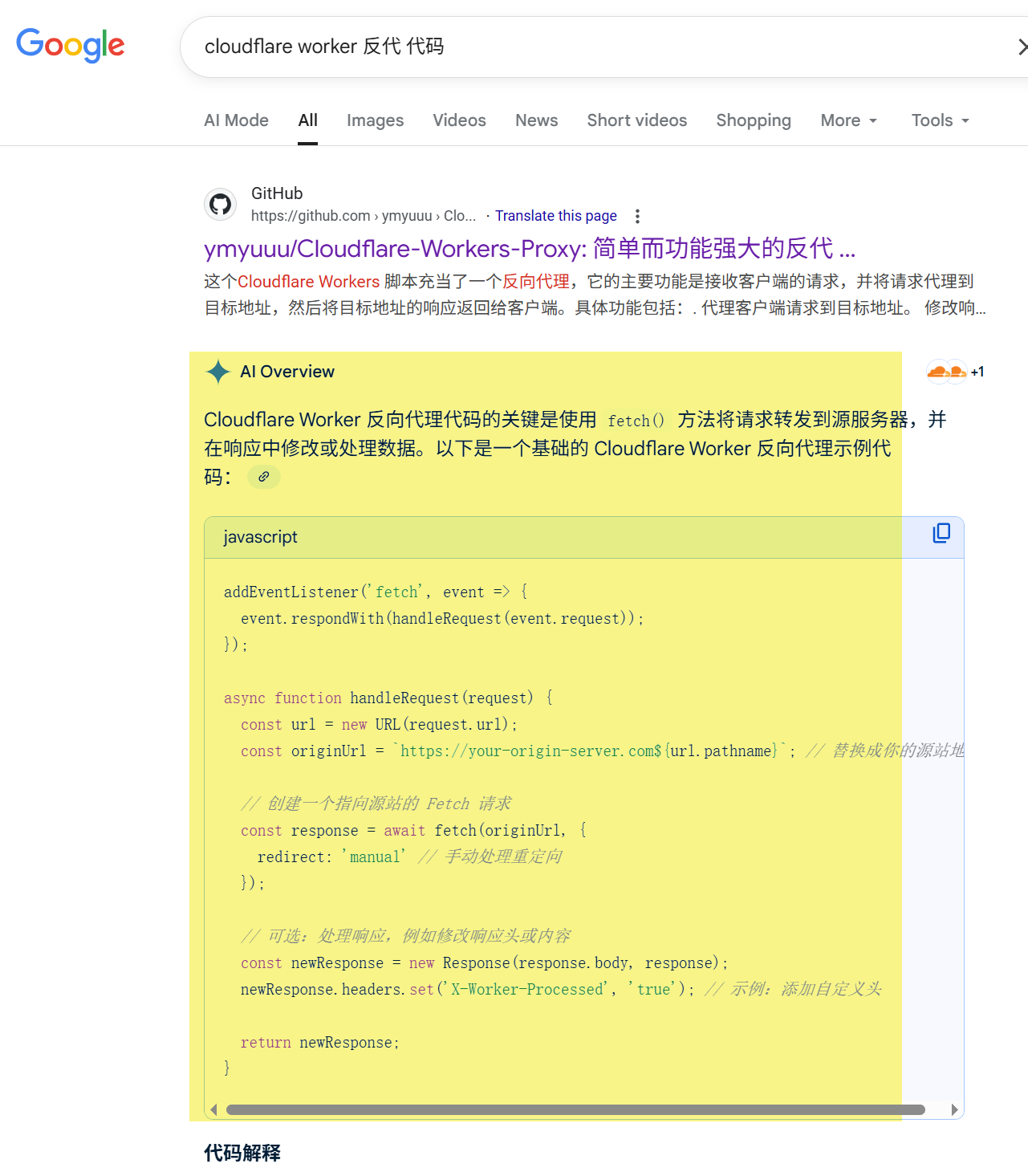 在google中搜索"cloudflare worker 反代 代码", 没想到直接就给了AI结果