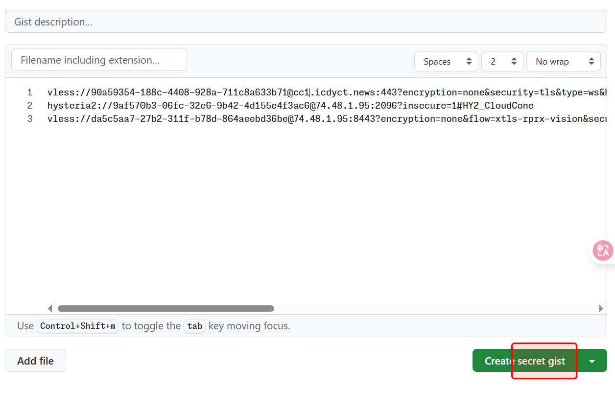 https://gist.github.com/crazypeace/7366b3c69b726b76aead58cc188c6f48/raw/6f495f1f657cee698ef0a00677fc2a035784e7e3/Sub4Family这里需要注意的是, 需要把上述链接中的红色部分去掉, 才是保证访问最新版本的链接, 即