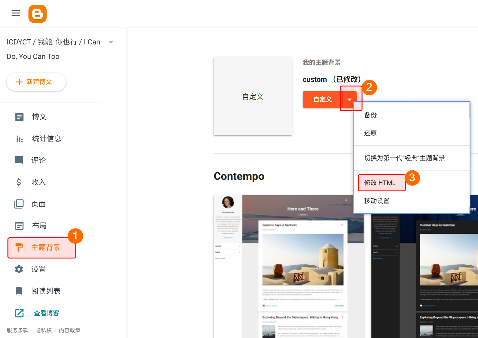 打开 blogger 后台 - 主题背景 - 修改HTML