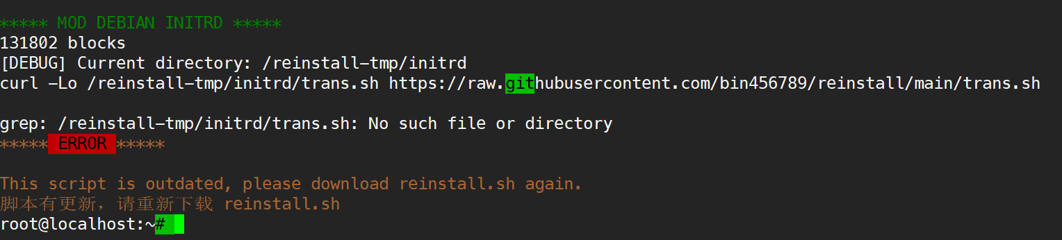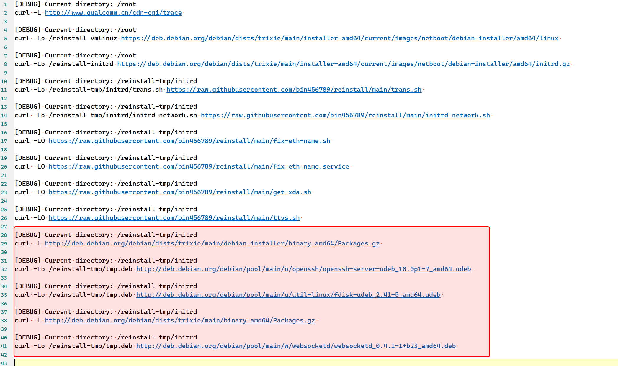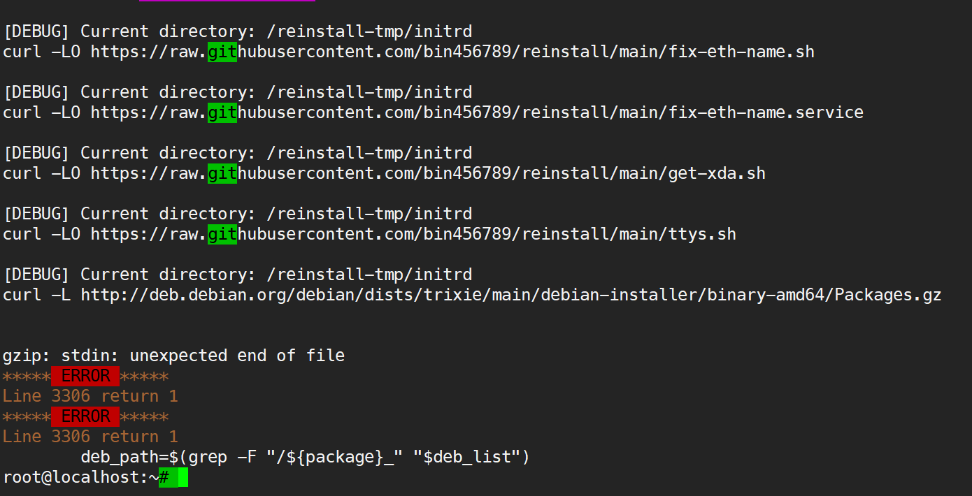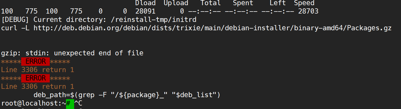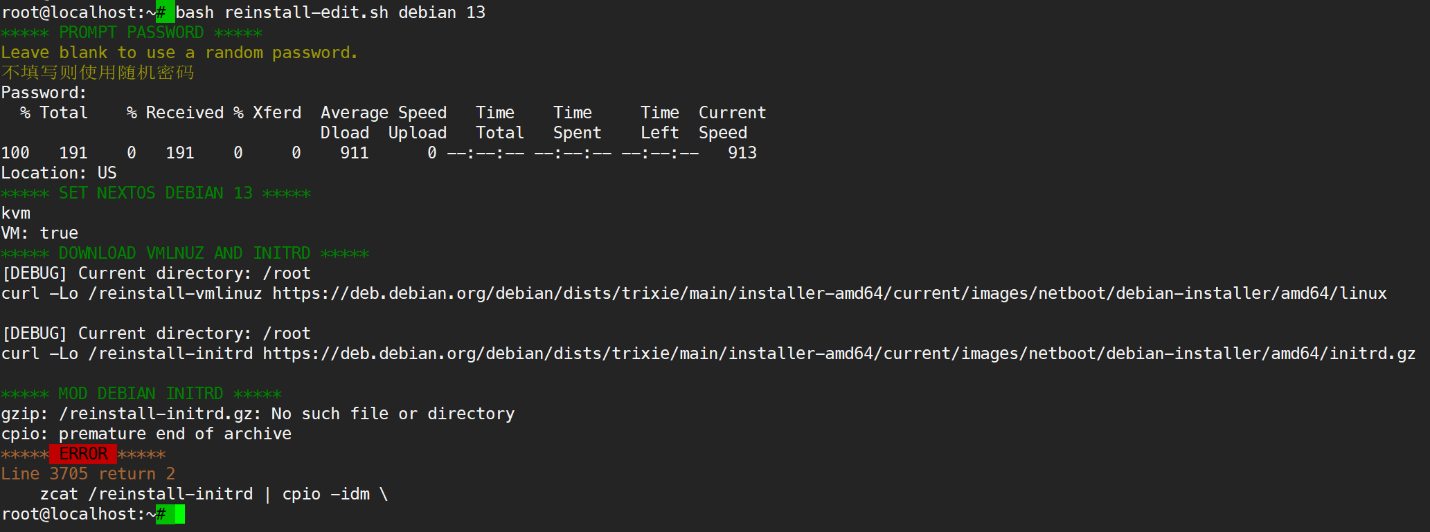 [DEBUG] Current directory: /rootcurl -Lo /reinstall-vmlinuz https://deb.debian.org/debian/dists/trixie/main/installer-amd64/current/images/netboot/debian-installer/amd64/linux[DEBUG] Current directory: /rootcurl -Lo /reinstall-initrd https://deb.debian.org/debian/dists/trixie/main/installer-amd64/current/images/netboot/debian-installer/amd64/initrd.gz