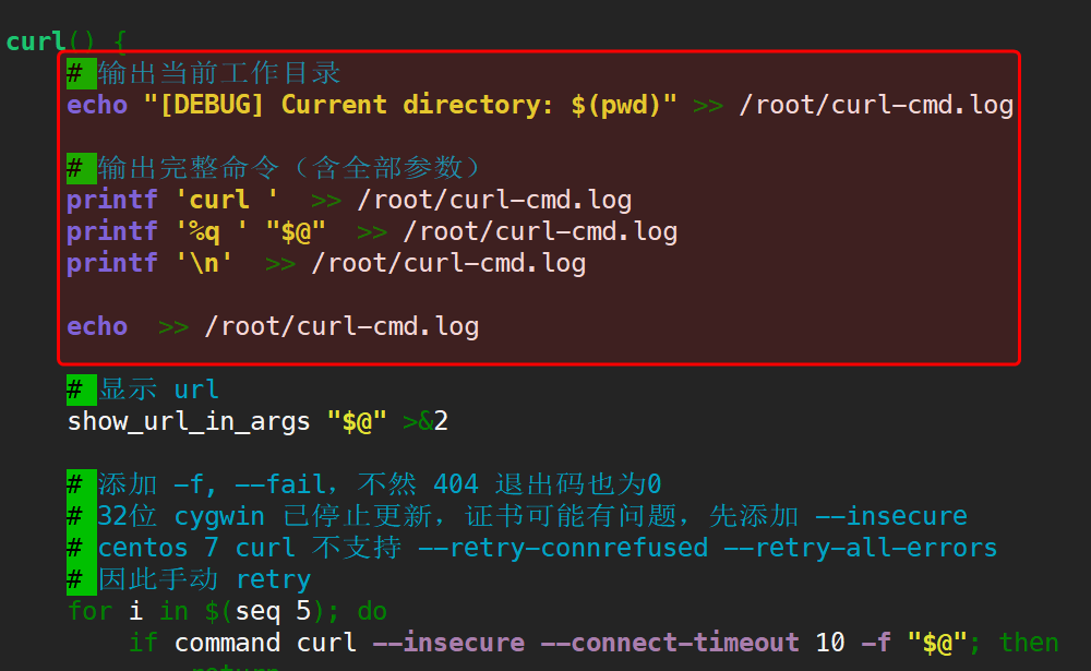 在脚本的开头, 看到作者已经实现了一个 curl 函数, 用于包装系统的curl.