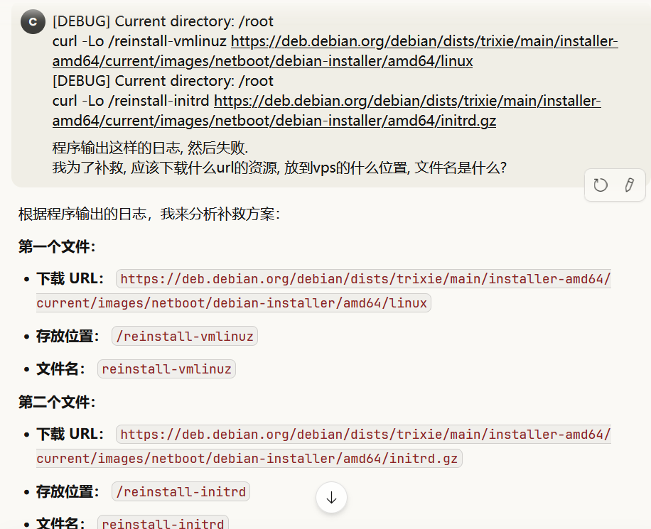 根据程序输出的日志,我来分析补救方案:第一个文件:下载 URL: https://deb.debian.org/debian/dists/trixie/main/installer-amd64/current/images/netboot/debian-installer/amd64/linux存放位置: /reinstall-vmlinuz文件名: reinstall-vmlinuz第二个文件:下载 URL: https://deb.debian.org/debian/dists/trixie/main/installer-amd64/current/images/netboot/debian-installer/amd64/initrd.gz存放位置: /reinstall-initrd文件名: reinstall-initrd