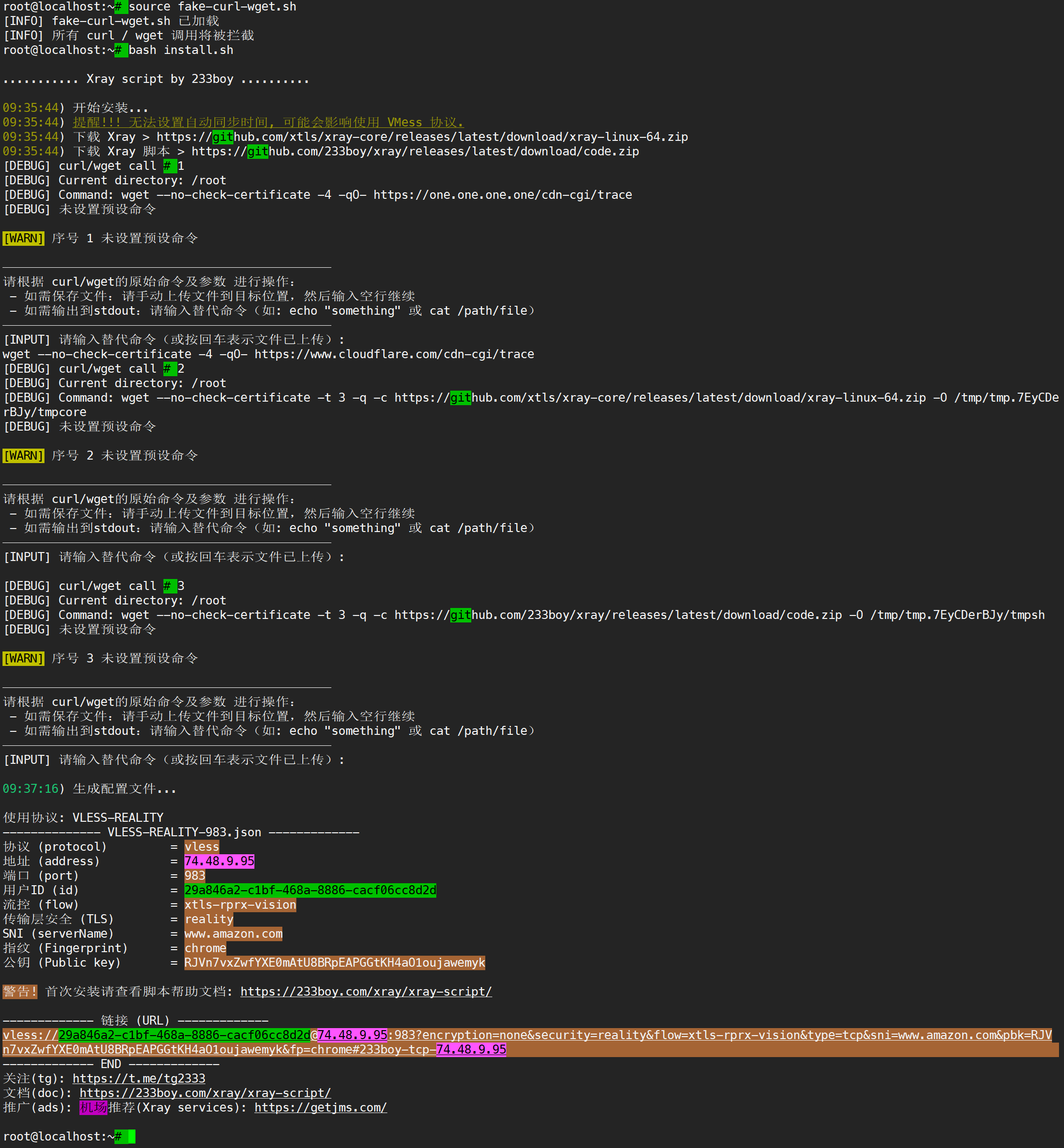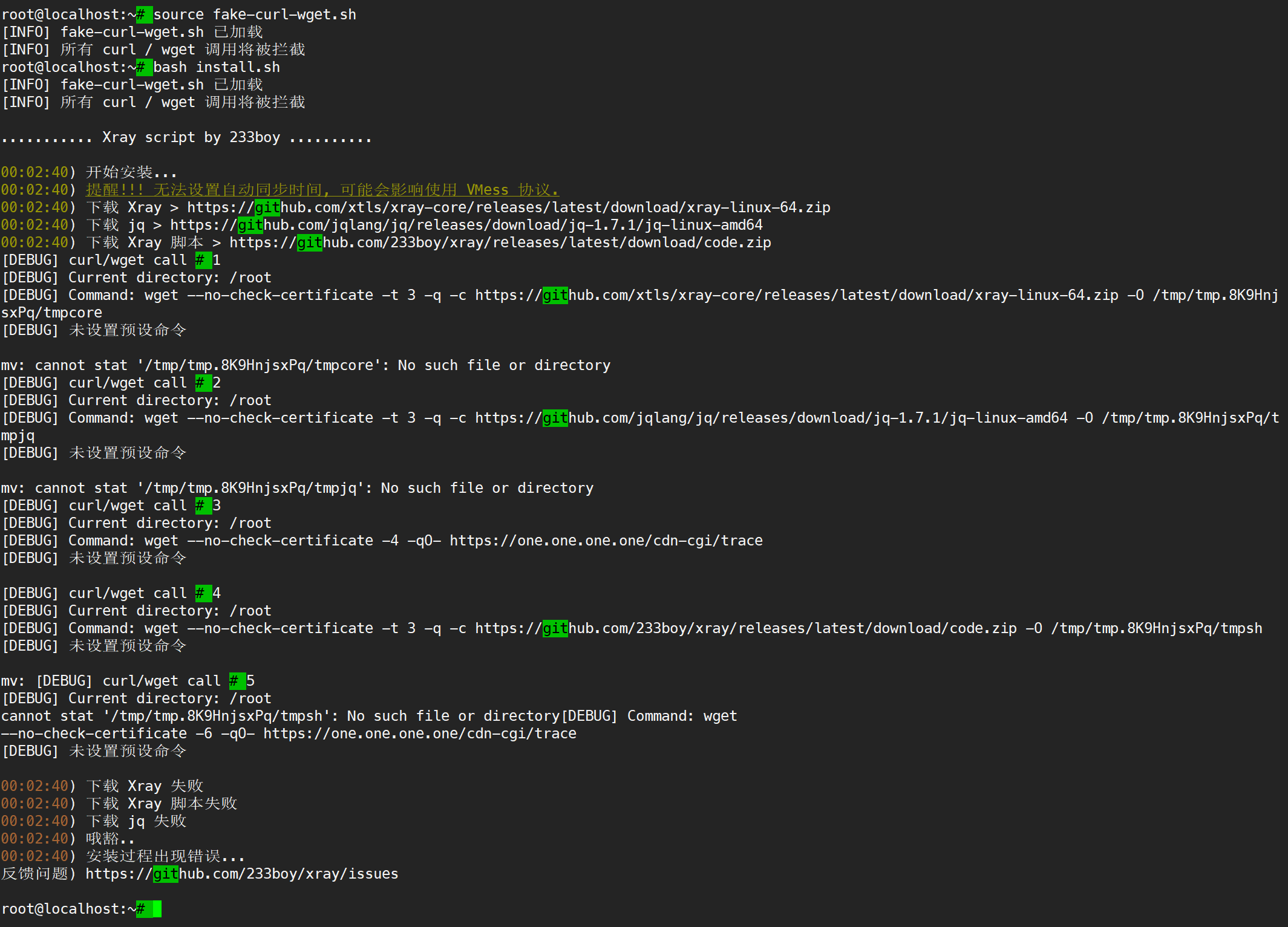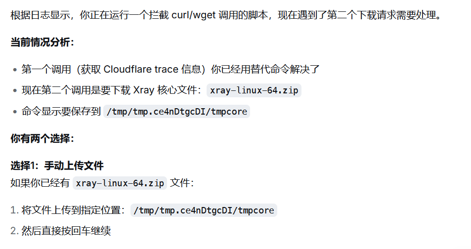 以下是我的shell终端操作和日志root@localhost:~# source fake-curl-wget.sh[INFO] fake-curl-wget.sh 已加载[INFO] 所有 curl / wget 调用将被拦截root@localhost:~# bash install.sh........... Xray script by 233boy ..........10:43:06) 开始安装...10:43:06) 提醒!!! 无法设置自动同步时间, 可能会影响使用 VMess 协议.10:43:06) 下载 Xray > https://github.com/xtls/xray-core/releases/latest/download/xray-linux-64.zip10:43:06) 下载 Xray 脚本 > https://github.com/233boy/xray/releases/latest/download/code.zip[DEBUG] curl/wget call # 1[DEBUG] Current directory: /root[DEBUG] Command: wget --no-check-certificate -4 -qO- https://one.one.one.one/cdn-cgi/trace[DEBUG] 未设置预设命令━━━━━━━━━━━━━━━━━━━━━━━━━━━━━━━━━━━━━━━━━━━━━━━[WARN] 序号 1 未设置预设命令请根据 curl/wget的原始命令及参数 进行操作:- 如需保存文件:请手动上传文件到目标位置,然后输入空行继续- 如需输出到stdout:请输入替代命令(如: echo "something" 或 cat /path/file)━━━━━━━━━━━━━━━━━━━━━━━━━━━━━━━━━━━━━━━━━━━━━━━[INPUT] 请输入替代命令(或按回车表示文件已上传):wget --no-check-certificate -4 -qO- https://www.cloudflare.com/cdn-cgi/trace[DEBUG] curl/wget call # 2[DEBUG] Current directory: /root[DEBUG] Command: wget --no-check-certificate -t 3 -q -c https://github.com/xtls/xray-core/releases/latest/download/xray-linux-64.zip -O /tmp/tmp.ce4nDtgcDI/tmpcore[DEBUG] 未设置预设命令━━━━━━━━━━━━━━━━━━━━━━━━━━━━━━━━━━━━━━━━━━━━━━━[WARN] 序号 2 未设置预设命令请根据 curl/wget的原始命令及参数 进行操作:- 如需保存文件:请手动上传文件到目标位置,然后输入空行继续- 如需输出到stdout:请输入替代命令(如: echo "something" 或 cat /path/file)━━━━━━━━━━━━━━━━━━━━━━━━━━━━━━━━━━━━━━━━━━━━━━━[INPUT] 请输入替代命令(或按回车表示文件已上传):请问我现在应该做什么?
