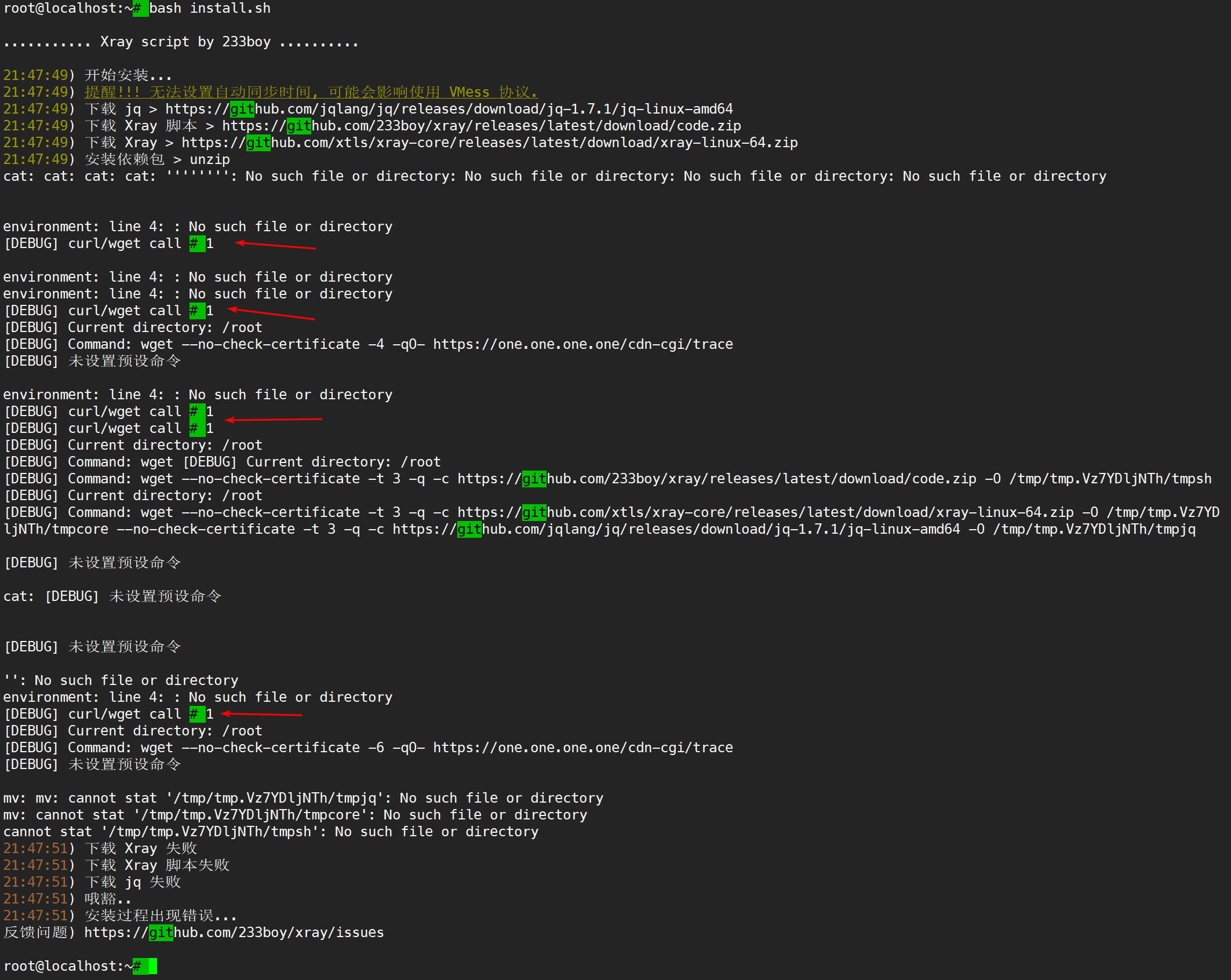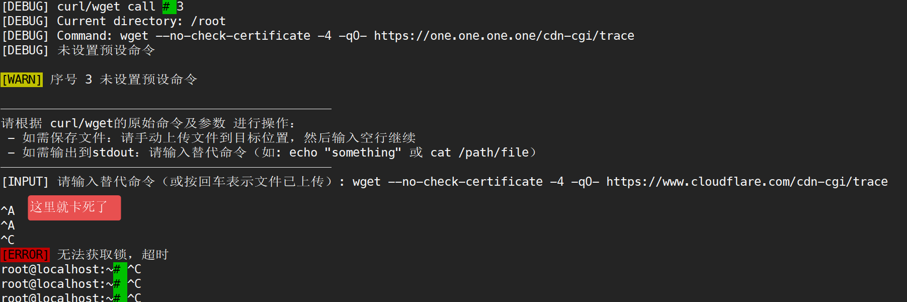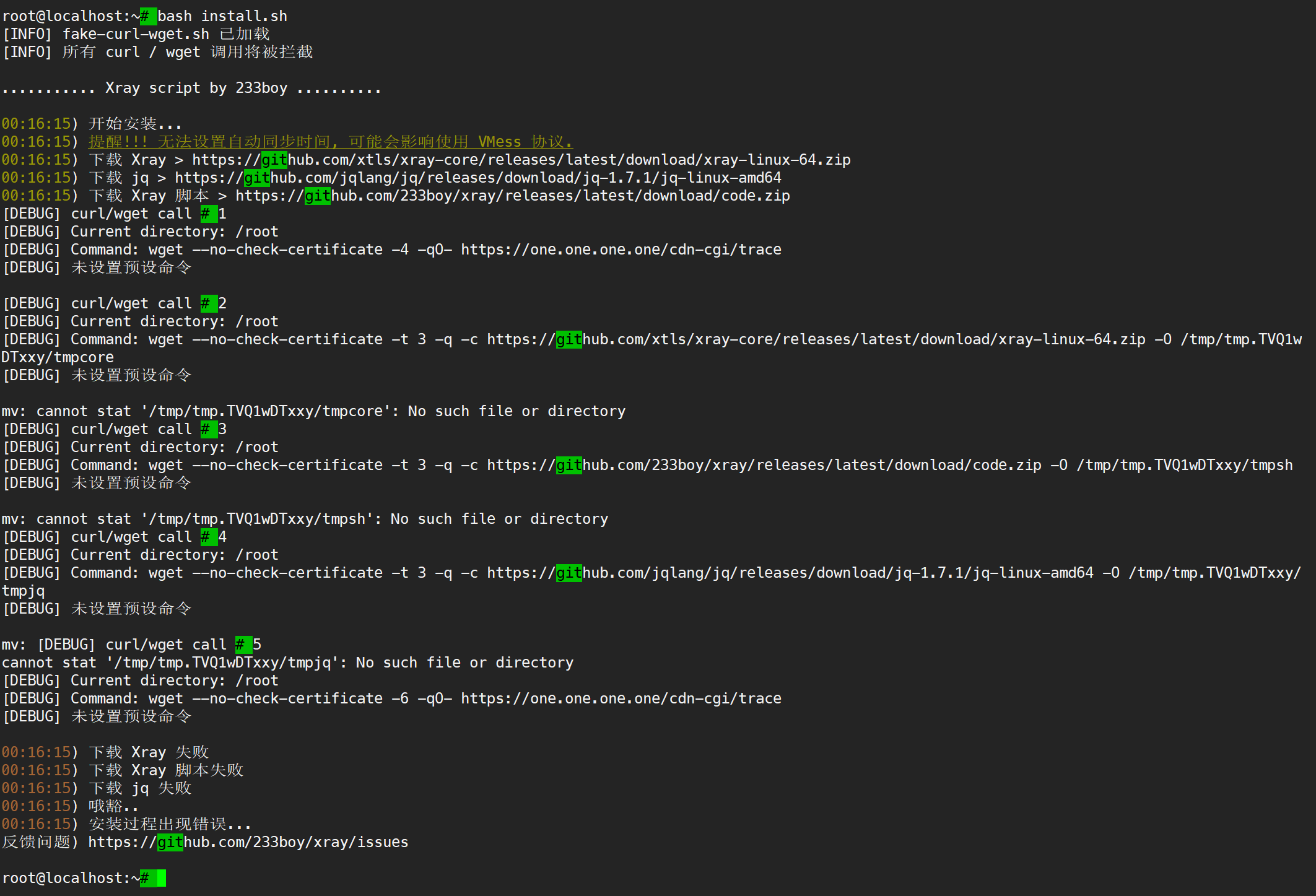 以下是我的shell终端操作和日志root@localhost:~# source fake-curl-wget.sh[INFO] fake-curl-wget.sh 已加载[INFO] 所有 curl / wget 调用将被拦截root@localhost:~# bash install.sh........... Xray script by 233boy ..........10:43:06) 开始安装...10:43:06) 提醒!!! 无法设置自动同步时间, 可能会影响使用 VMess 协议.10:43:06) 下载 Xray > https://github.com/xtls/xray-core/releases/latest/download/xray-linux-64.zip10:43:06) 下载 Xray 脚本 > https://github.com/233boy/xray/releases/latest/download/code.zip[DEBUG] curl/wget call # 1[DEBUG] Current directory: /root[DEBUG] Command: wget --no-check-certificate -4 -qO- https://one.one.one.one/cdn-cgi/trace[DEBUG] 未设置预设命令━━━━━━━━━━━━━━━━━━━━━━━━━━━━━━━━━━━━━━━━━━━━━━━[WARN] 序号 1 未设置预设命令请根据 curl/wget的原始命令及参数 进行操作:- 如需保存文件:请手动上传文件到目标位置,然后输入空行继续- 如需输出到stdout:请输入替代命令(如: echo "something" 或 cat /path/file)━━━━━━━━━━━━━━━━━━━━━━━━━━━━━━━━━━━━━━━━━━━━━━━[INPUT] 请输入替代命令(或按回车表示文件已上传):wget --no-check-certificate -4 -qO- https://www.cloudflare.com/cdn-cgi/trace[DEBUG] curl/wget call # 2[DEBUG] Current directory: /root[DEBUG] Command: wget --no-check-certificate -t 3 -q -c https://github.com/xtls/xray-core/releases/latest/download/xray-linux-64.zip -O /tmp/tmp.ce4nDtgcDI/tmpcore[DEBUG] 未设置预设命令━━━━━━━━━━━━━━━━━━━━━━━━━━━━━━━━━━━━━━━━━━━━━━━[WARN] 序号 2 未设置预设命令请根据 curl/wget的原始命令及参数 进行操作:- 如需保存文件:请手动上传文件到目标位置,然后输入空行继续- 如需输出到stdout:请输入替代命令(如: echo "something" 或 cat /path/file)━━━━━━━━━━━━━━━━━━━━━━━━━━━━━━━━━━━━━━━━━━━━━━━[INPUT] 请输入替代命令(或按回车表示文件已上传):请问我现在应该做什么?
