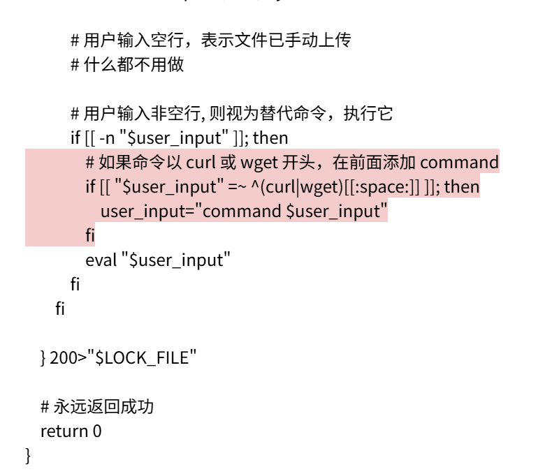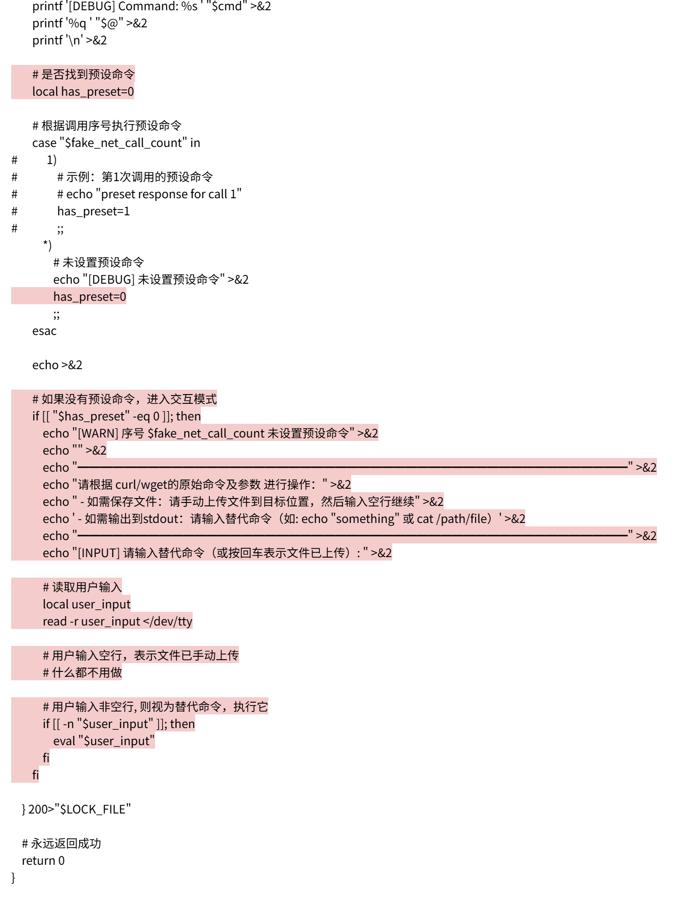 1) 当根据序号 进行case逻辑 发现没有匹配的预设命令时, 脚本暂停. 等待使用者输入.2) 根据日志打印的 curl 或 wget 命令及参数. 使用者判断 当前序号的操作是要保存文件, 还是要输出信息到stdout.2a) 如果当前操作是保存文件, 则 使用者自己上传文件到指定位置. 输入 空. 脚本继续执行.2b) 如果当前操作是输出 信息到 stdout, 则 使用者输入 替代指令. 脚本执行替代指令.如, 使用者输入 echo "something" 或 cat /path/to/file