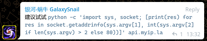 python3 -c 'import sys, socket; [print(res) for res in socket.getaddrinfo(sys.argv[1], int(sys.argv[2] if len(sys.argv) > 2 else 80))]' api.myip.la
