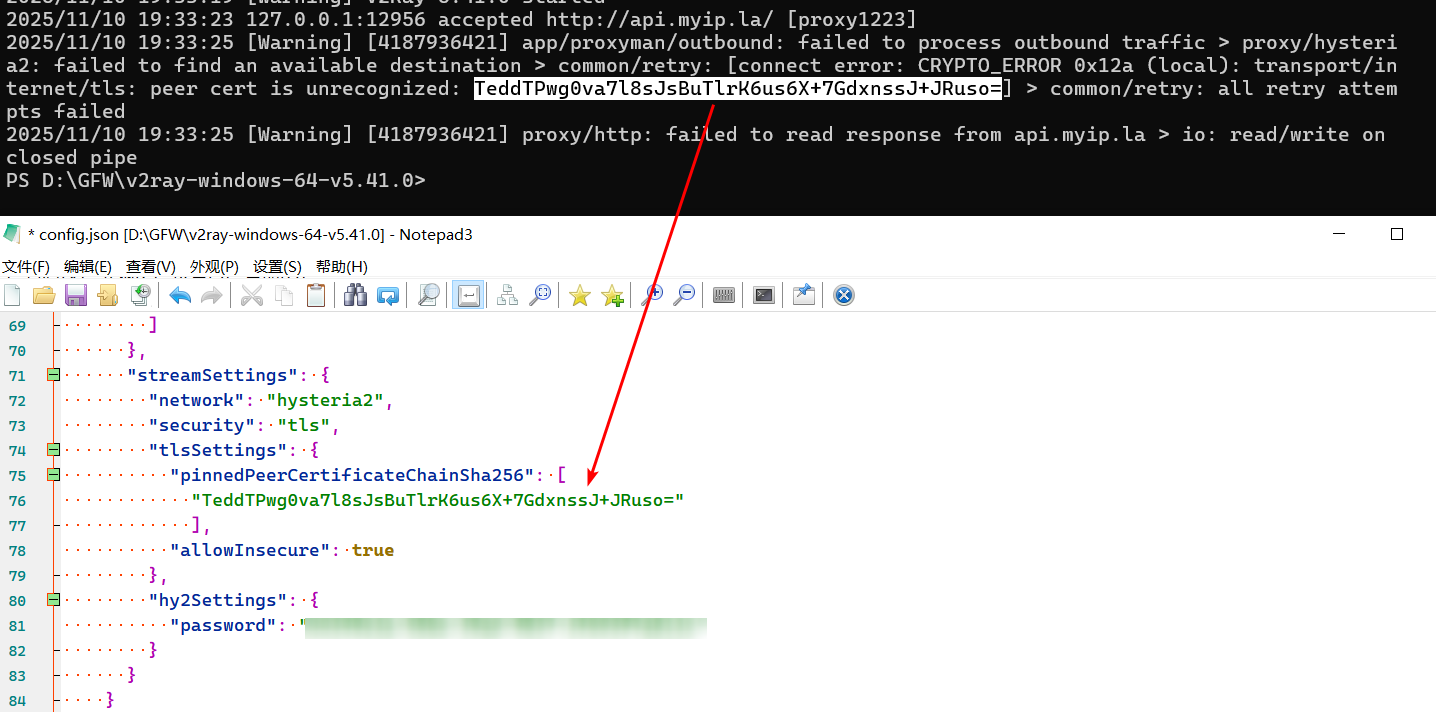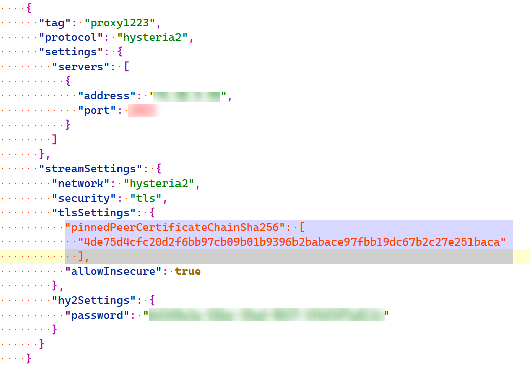 {"protocol": "hysteria2","settings": {"servers": [{"address": "服务.端.IP.地址","port": 服务端口}]},"streamSettings": {"network": "hysteria2","security": "tls","tlsSettings": {"pinnedPeerCertificateChainSha256": ["TeddTPwg0va7l8sJsBuTlrK6us6X+7GdxnssJ+JRuso=" // openssl x509 -noout -fingerprint -sha256 -in your_cert.crt | sed 's/^.*=//' | xxd -r -p | base64],"allowInsecure": true},"hy2Settings": {"password": "密码"}}}