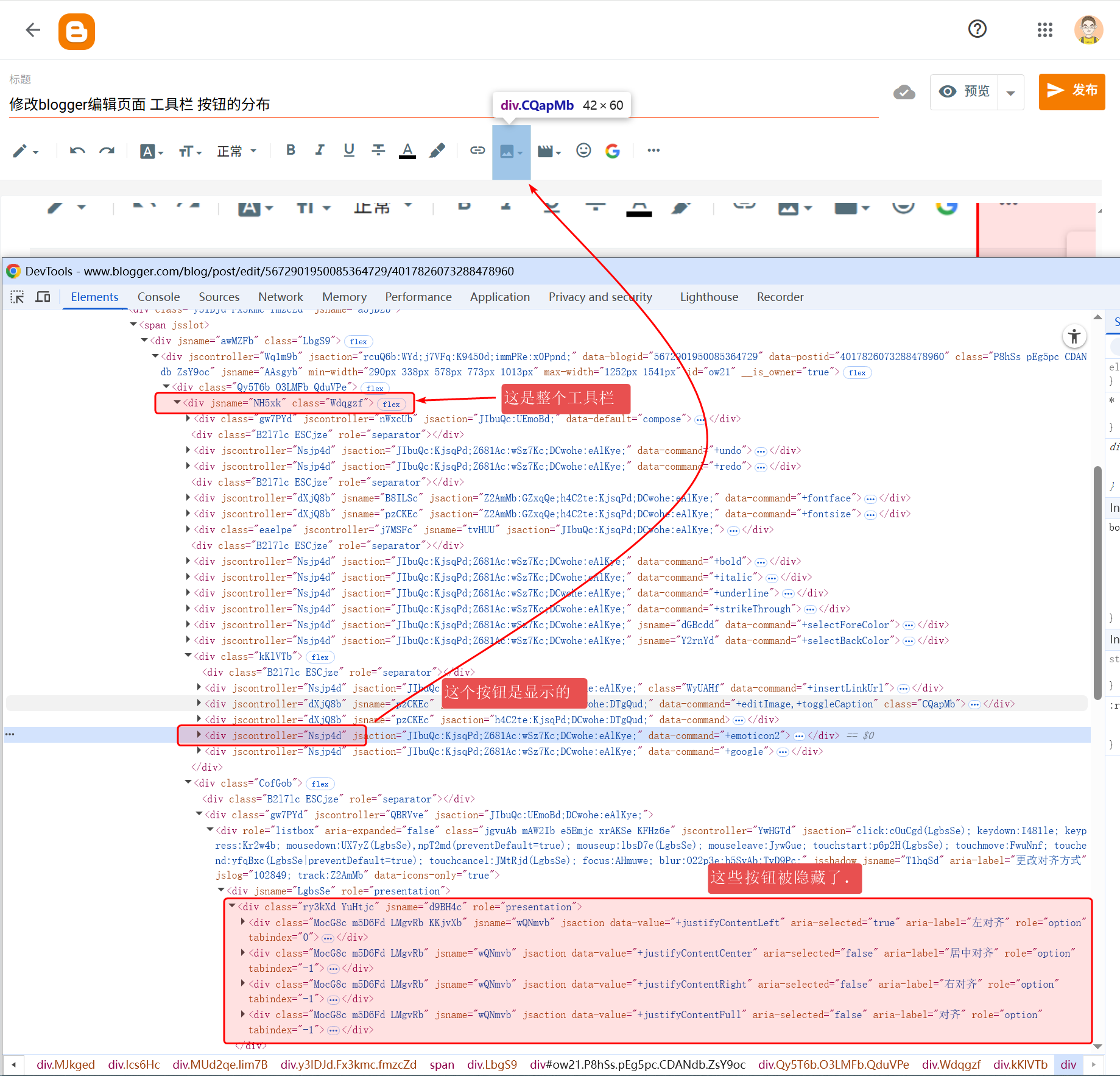 发现, 就在这个工具栏里面, 有些按钮被隐藏了. 也就是说, HTML内容里是有的, 但是页面上不显示.