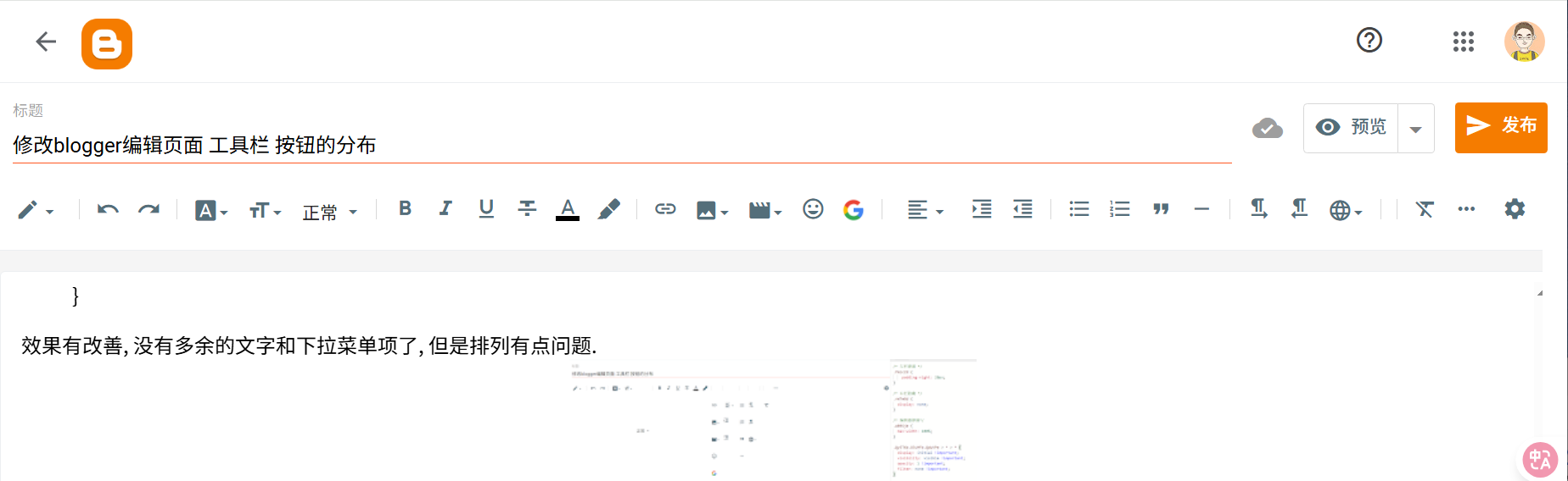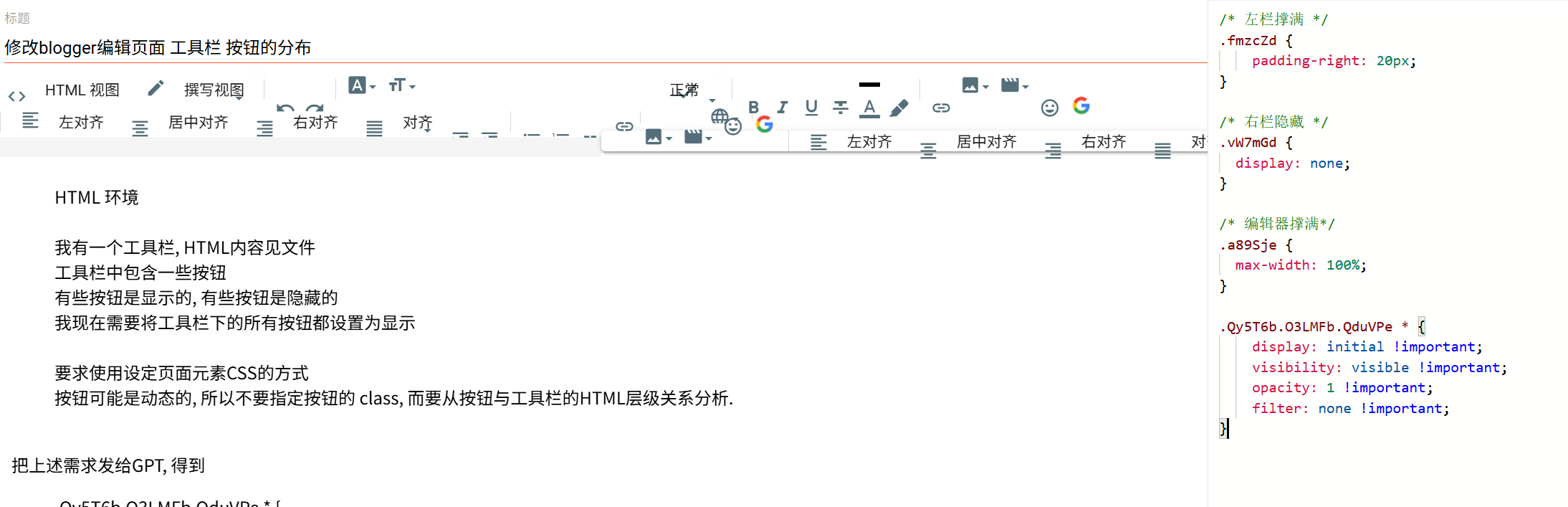书接上文 我们已经隐藏了bloger编辑器的右栏但工具栏在空间足够的条件下, 还是产生了折叠分栏.