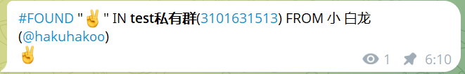 #FOUND (https://t.me/c/3101631513/3) "✌️" IN test私有群(3101631513) FROM 小 白龙(@hakuhakoo)✌️