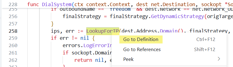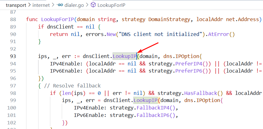https://github.dev/XTLS/Xray-core/blob/b69a376aa1b61ad94c9c05b2c2cd263567b8cc23/transport/internet/dialer.go#L88很明显, 这个LookupForIP里根据 IPv4优先 IPv6优先等策略, 完成DNS解析的工作.